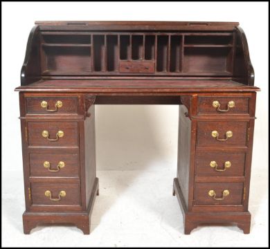 An antique style mahogany roll top tambour fronted childs desk having bracket feet with faux drawer pedestal cupboards and single drawers with tambour top having appointed interior within. Measures: 80cm high x 83cm wide x 41cm depth.