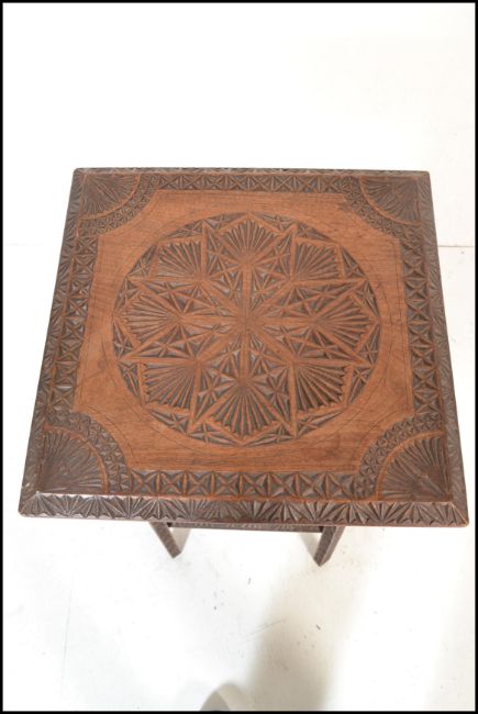 A 19th century Victorian Century carved mahogany  tier side / lamp  table having a square top with carved geometric decoration to the sides, raised on splayed carved decoration legs with a lower tier near the base. Measures: 73cm high x 42cm wide.