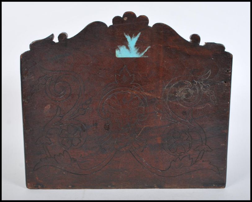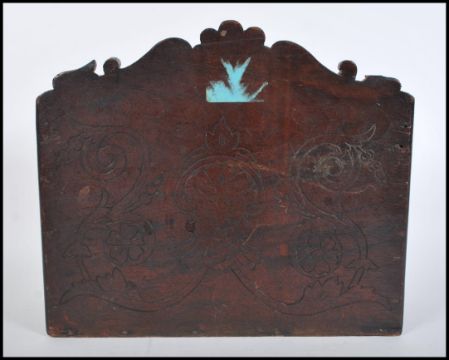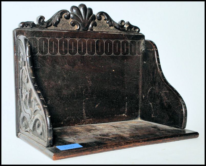 A late 19th Century Victorian oak table book trough having carved decoration throughout with shell decoration atop, carved foliate and swirl decorated sides. Engraved detailing to verso with central mask. Measures 27cm tall by 31cm wide by 18cm deep.