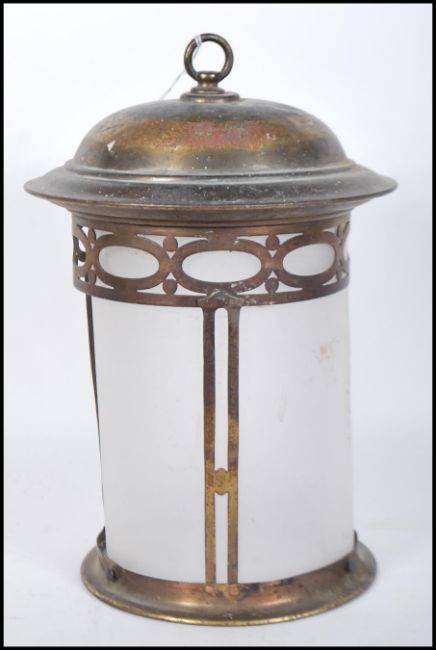 A early 20th Century Edwardian Arts & Crafts pierced brass framed cylindrical hall lantern with internal frosted glass shade. Measures 32cm tall by 22cm diameter.