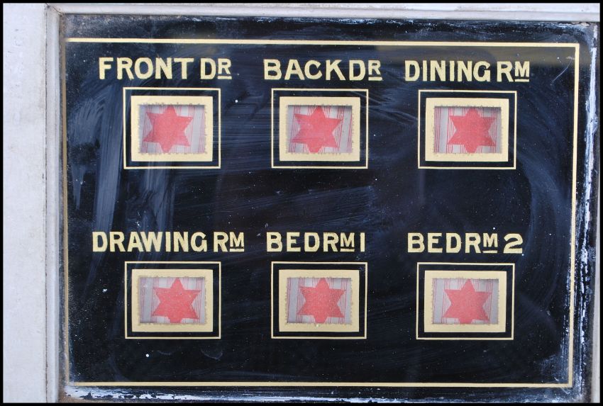 A late Victorian / early 20th Century Edwardian servants six division bell casing / butlers call box being wooden cased with six glass fronted windows for Front Door, Back Door, Dining Room, Drawing Room, Bedroom 1 and Bedroom 2.An Edwardian servants 5 division bell casing / butlers call box with a wooden casing and glass front with signs for Reception, Garden, Bedroom, Bathroom etc.An Edwardian servants 5 division bell casing / butlers call box with a wooden casing and glass front with signs for Reception, Garden, Bedroom, Bathroom etc.
