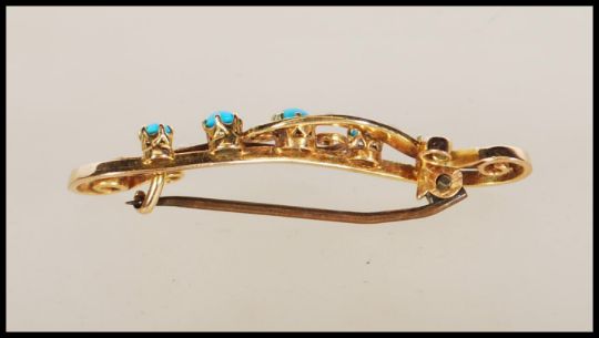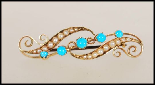 A 19th Century Victorian 15ct gold seed pearl and turquoise brooch of scrolled form having lines of half pearls and inset turquoise stones. Stamped to verso.