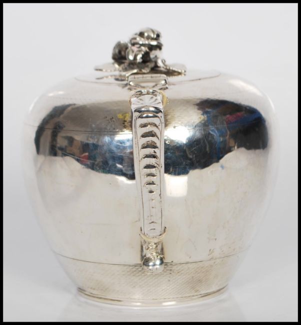 A 19th Century Victorian silver hallmarked teapot of squat circular form having rose finial to the hinged lid. The handle of the teapot with leaf terminal and ivory insulators and foliate decoration to the spout. Hallmarked to base and under side of lid for London, date letter i 1864, makers mark for John Samuel Hunt. Total weight 497g. Measures: 13cm tall