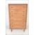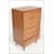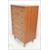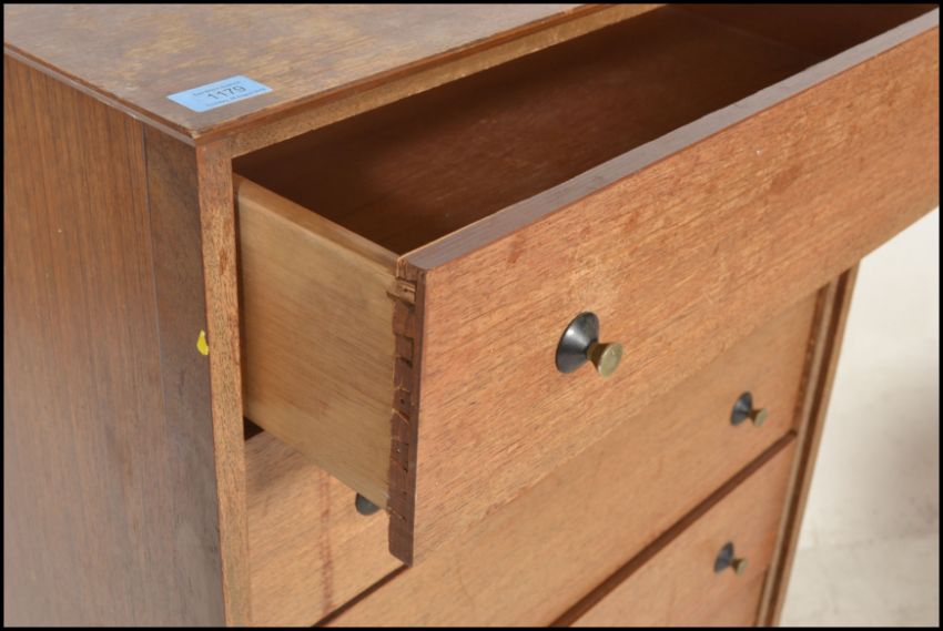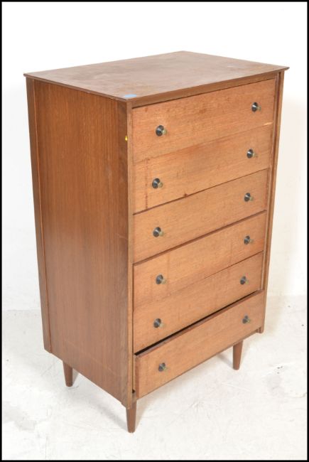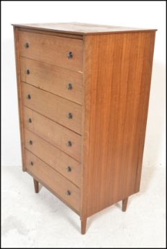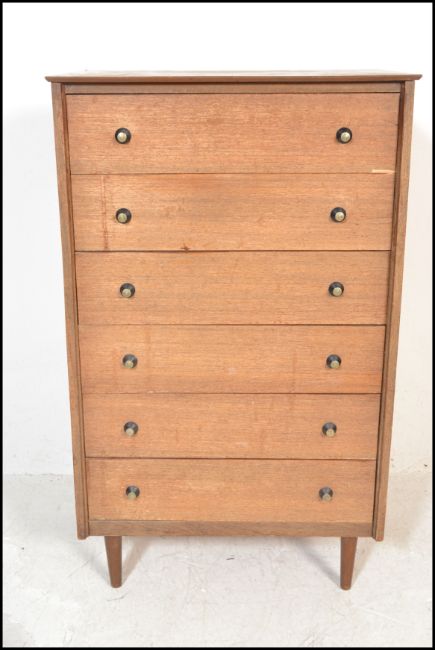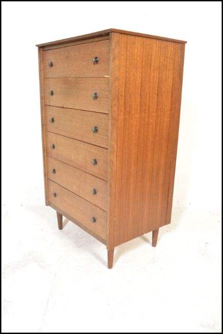 A mid century teak wood Danish influence pedestal chest of drawers. Raised on angular legs, the upright body with a central bank of drawers.