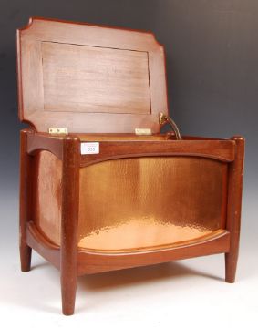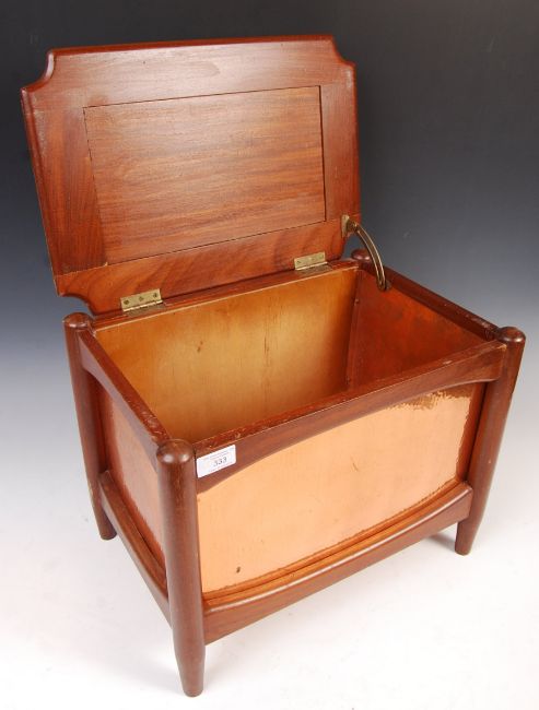 A 1970's 20th century retro vintage teak ottoman / lidded storage box having recessed copper beaten panels with teak hinged top. All raised on short tapering legs. Measures; 35cm x 45cm x 30cm.