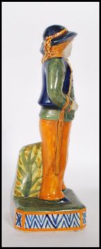 A 19th Century French Victorian ceramic faience figurine of a brightly glazed gentleman in hat with a long truncheon hanging to his side, raised on a plinth base with notation reading YANN, marked to base Hen Riot Quimper 143. Measures: 22cm tall.
