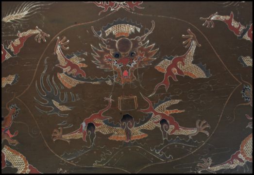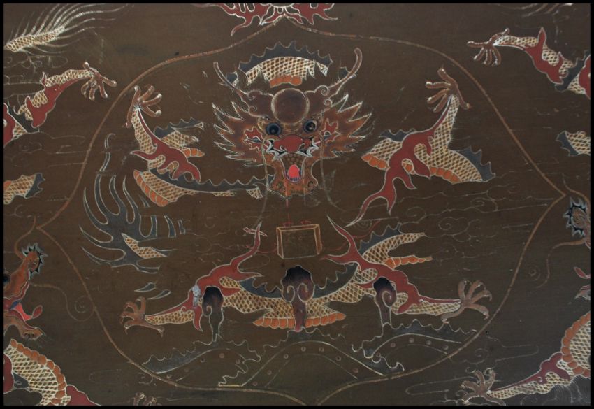 An early / mid 20th Century Chinese lacquer tray decorated with five toed Chinese dragons and floral sprays, having pierced decoration to the raised sides.