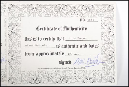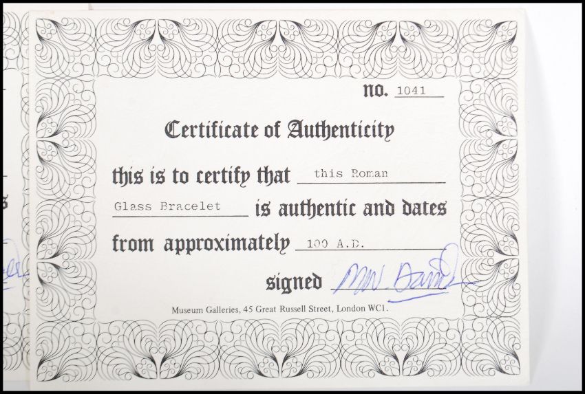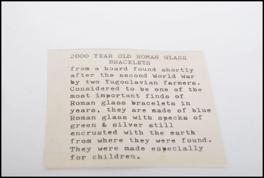 A group of three Roman blue glass bangles to include two childs bangles and one larger, believed to be dating from 100 AD. A with certificates of authenticity.