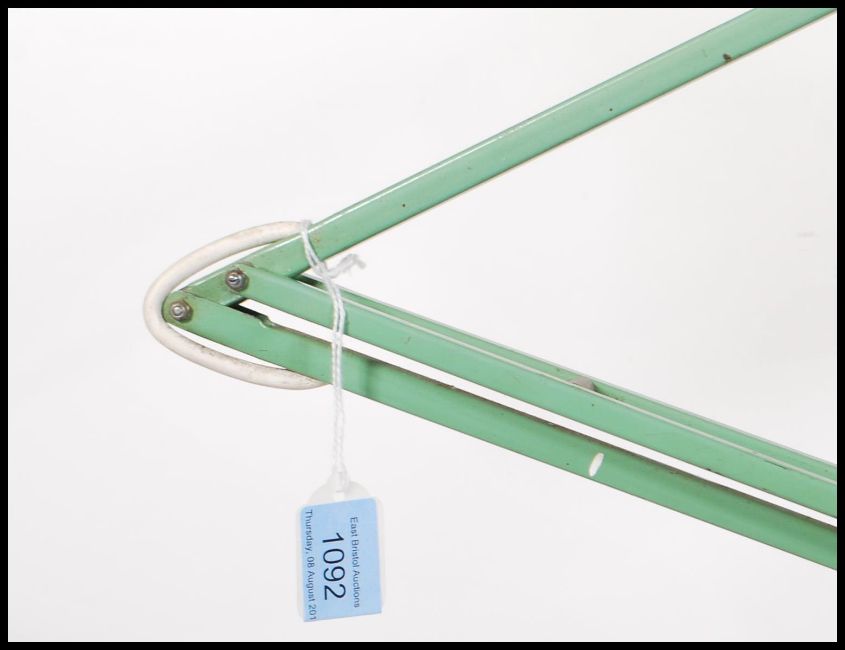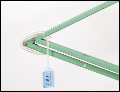 A vintage early 20th century retro industrial two step Herbert Terry angle poise lamp light in a light green colour. The original conical shade with cooling holes along the back. Marks to front and back of fork for Herbert Terry & Sons Anglepoise.