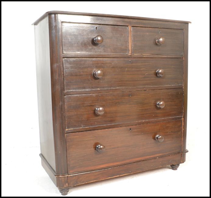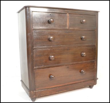 A 19th Century Victorian pine scrumble finish chest of two over three graduating drawers, turned knob handles raised on bun feet. Measures 110cm high x 105cm wide x 46cm depth.