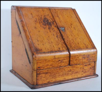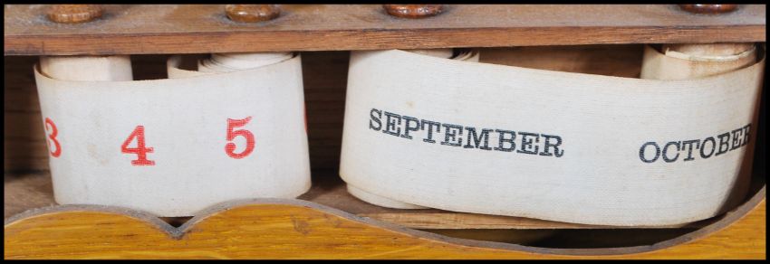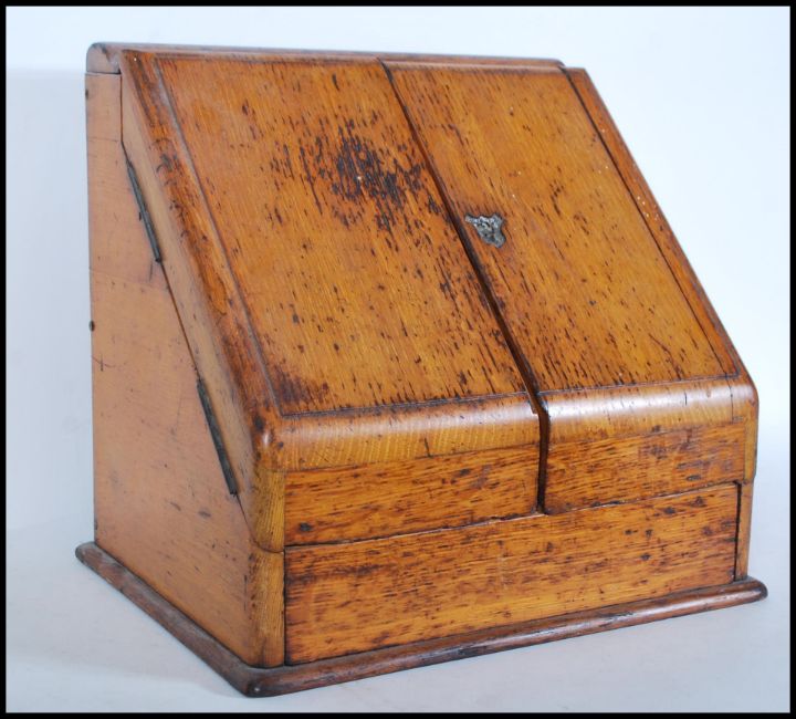 An early 20th Century light oak stationary desk tidy with double doors revealing compartmental letter/paper tidy, perpetual callendar, single drawer base