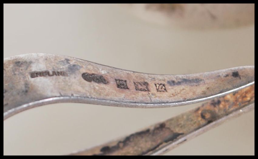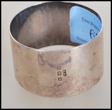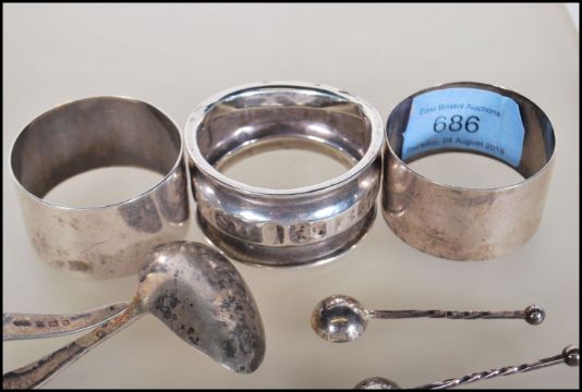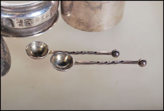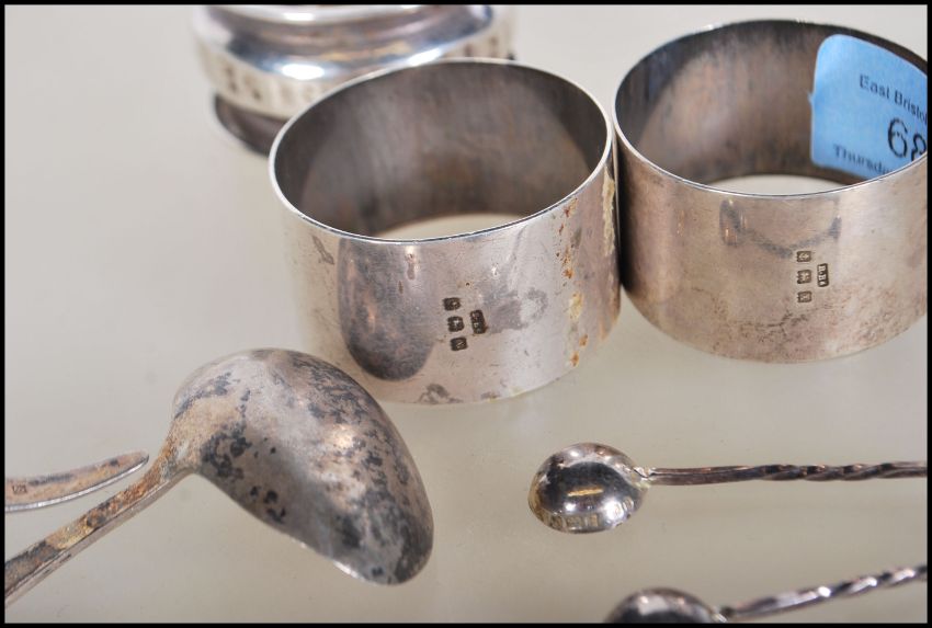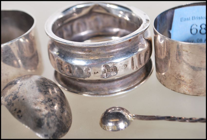 A collection of silver hallmarked items to include three napkin rings, a babies feeding / Christening spoon and two silver hallmarked condiment spoons.