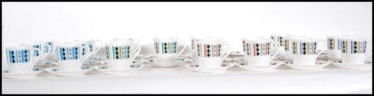 A retro mid century Royal Adderley ' Masquerade ' pattern coffee service, each stamped to base and with classic 1970's geometric patterns. The service to include coffee cans, saucers etc. Together with a collection of Royal Copenhagen Denmark dinner and side plates, all with various patterns of fruits and berrys. Stamped verso 925/9763