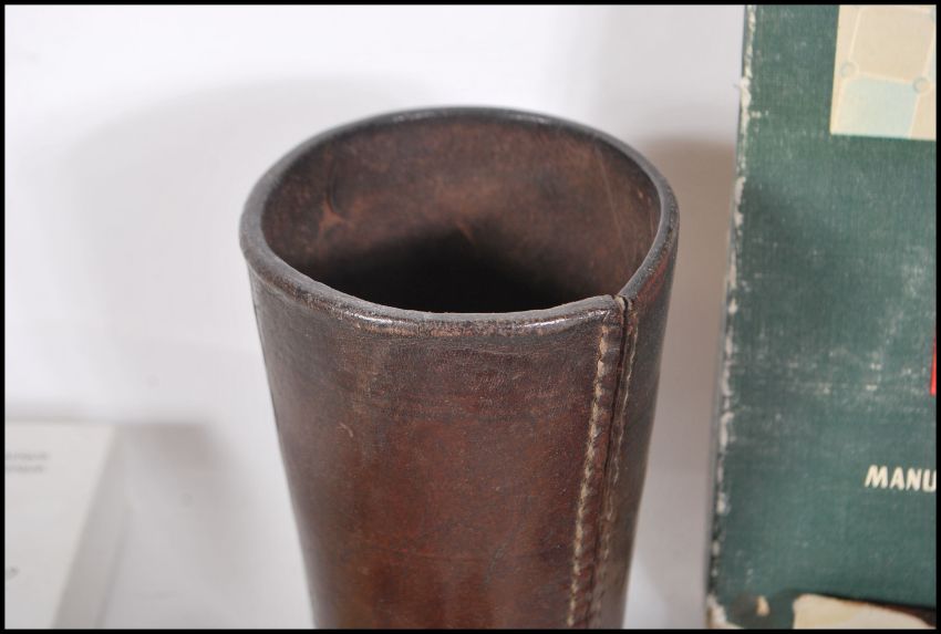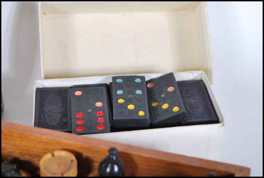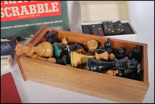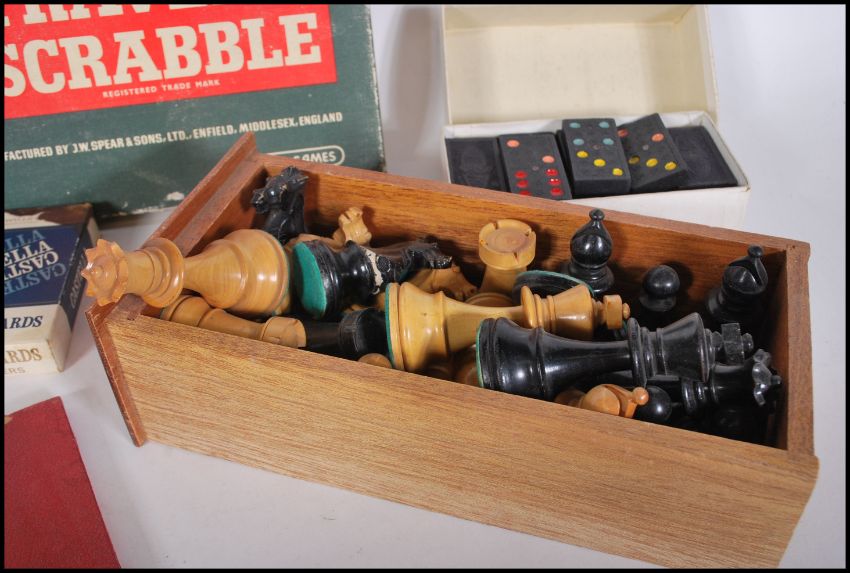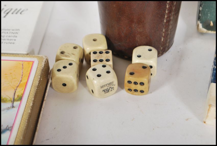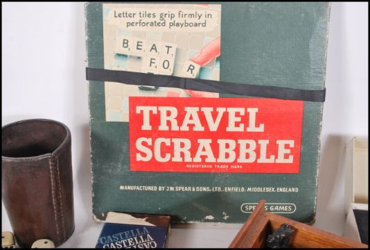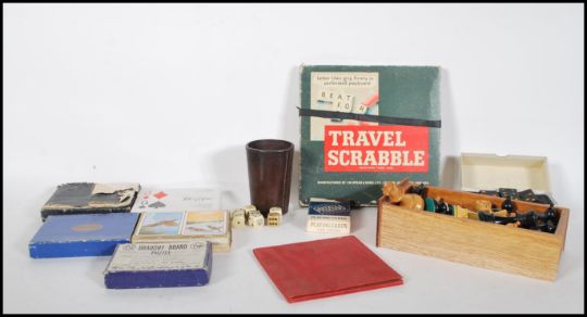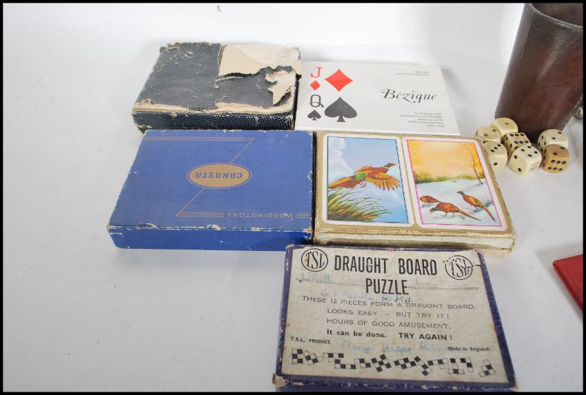 A collection of vintage 20th Century board games and card games to include a chess set, travel Scrabble, Piatnik, Bezique, playing cards, Canasta, leather dice cups and dices.