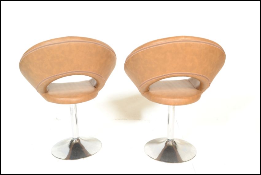 A pair of contemporary modernist satellite style swivel chairs raised on central chromed columns with circular bases, the chair upholstered in brown leather with curved circular back rests. Measures: 85cm high x 65cm wide x 56cm depth.