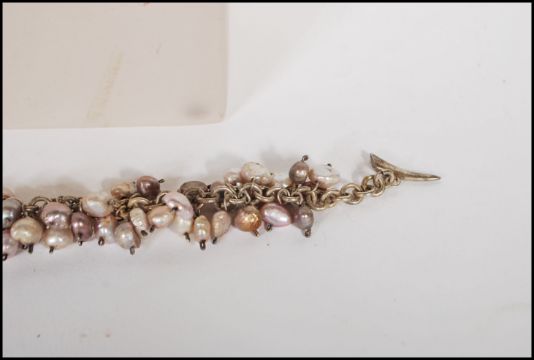 A silver hallmarked ladies grey baroque pearl cluster bracelet having a toggle clasp, along with a spaced grey pearl necklace with a lobster clasp. Necklace measures 18 inches. Bracelet measures 7 inches.