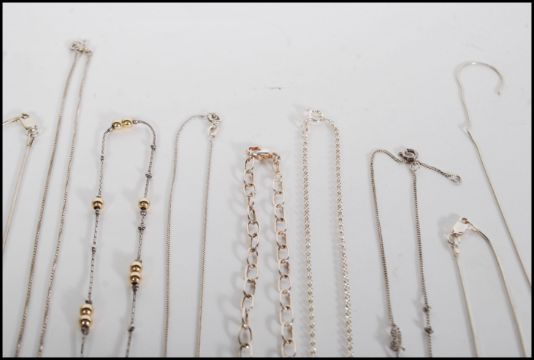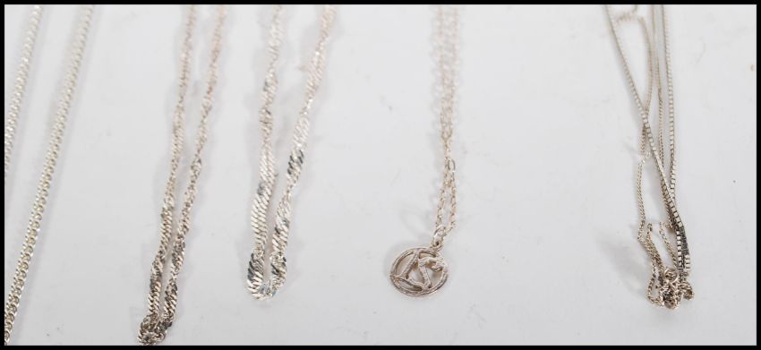 A selection of stamped 925 necklace chains and pendants to include a crucifix pendant set with a oval cut purple stone, a celtic knot collar necklace, a St Christopher pendant, an engraved locket of oval form, two snake chain necklaces etc. Total weight 105.8g.
