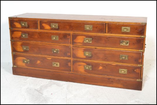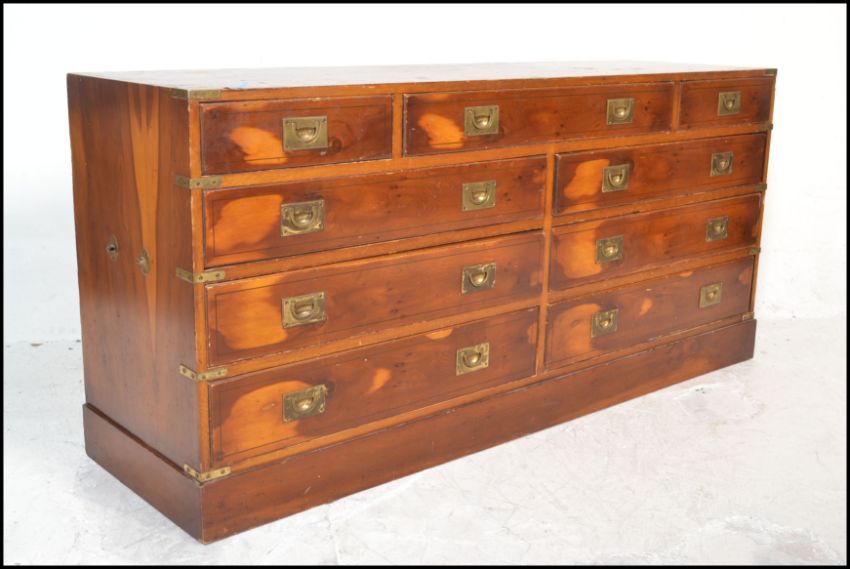 A Regency revival 20th century yew wood campaign ' Captains ' double chest of drawers. The wide body with a series of short and deep drawers having inset brass campaign handles and carry handles to the sides. Measures: 70cm high x 150cm wide x 45cm depth.