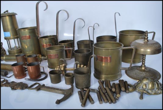 A collection of vintage 20th Century brass wares to include a Welsh miners lamp, spirit measures, grain measures, scales etc.