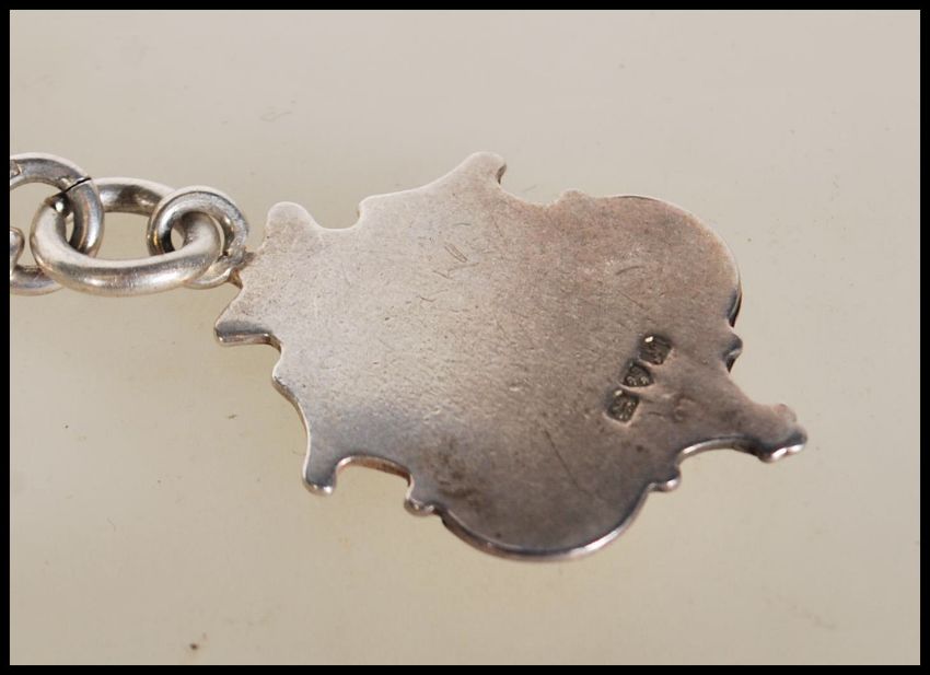 A early 20th Century hallmarked silver albert pocket watch chain bearing hallmark to every link and T bar. The links graduating on both sides with central T bar and fob. Fob hallmarked for Chester date letter N 1913. Total weight 52.9g. Measures 14.5 inches.