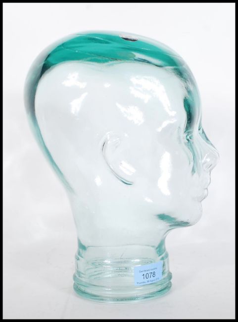 A vintage retro 20th century shop display / millinery mannequin head of pressed glass construction with moulded features. Bearing label to top. Measures 29cm tall.
