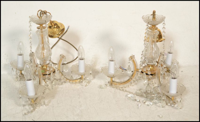 A pair of electric ceiling chandelier lights purchased from Harrods with glass droplets.