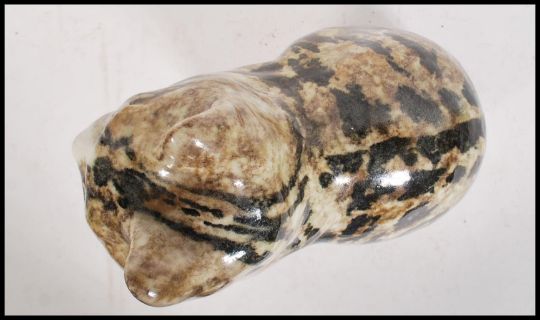 A vintage Winstanley ceramic tabby cat figurine modelled in a seated position having a brown mottled glaze with glass eyes. Measures 31 cm tall.