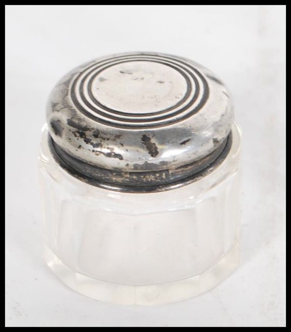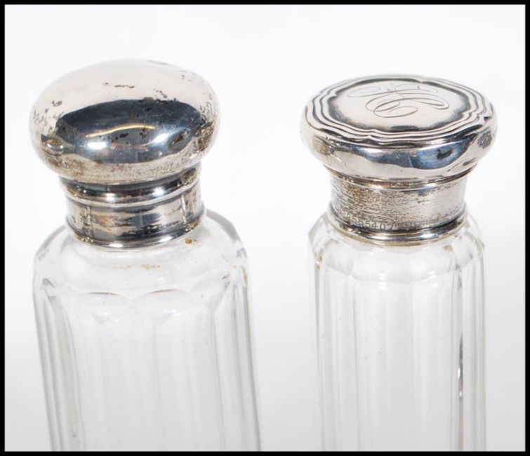 A collection of silver lidded faceted glass dressing table scent bottles to include a pair of Asprey bottles (hallmarked London 1896), a pair of W A Ellwick bottles (hallmarked Birmingham 1911) along with two other bottles with silver hallmarked lids. Silver weight 48.1g.