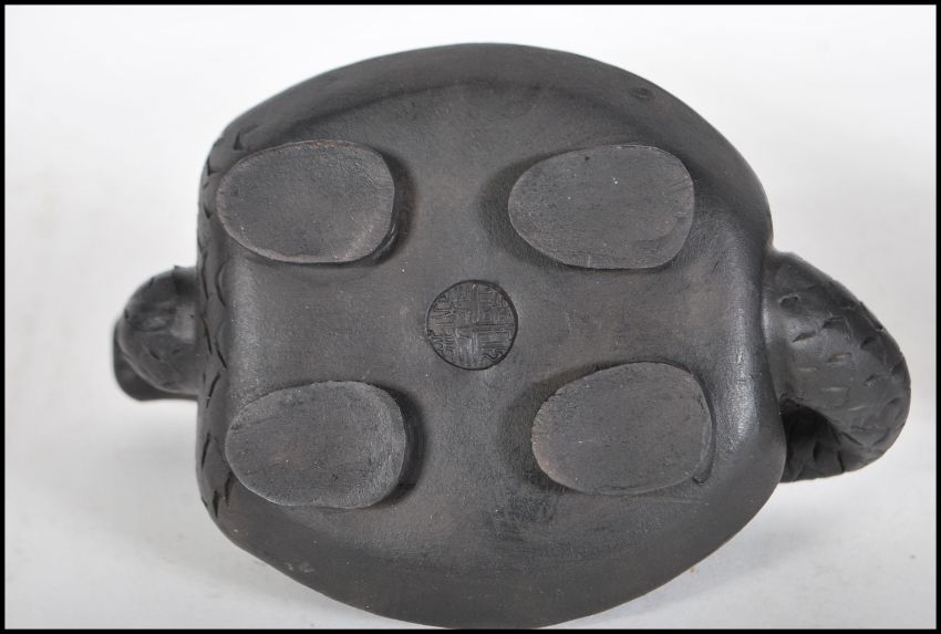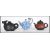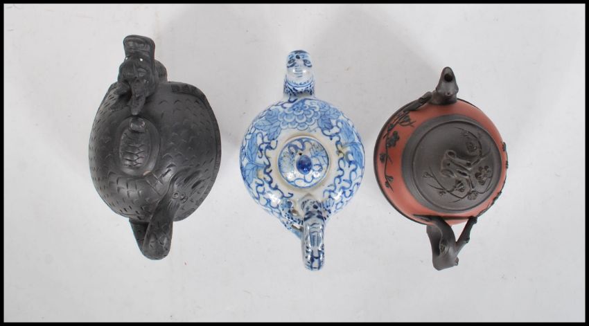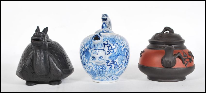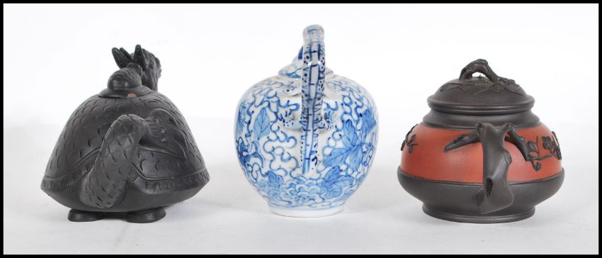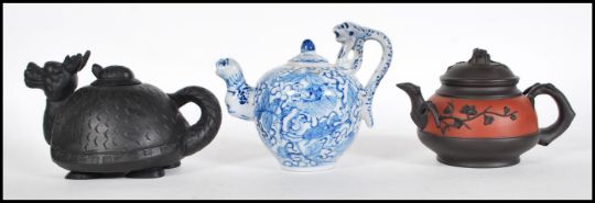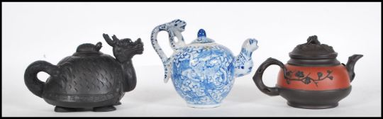 A group of three Chinese teapots dating from the early 20th Century to include one modeled as a dragon covered with a shell, with the cover in the form of a tortoise, character marks to base. Another having floral decoration with handle and spout being a branch, marks to lid and base. Together with a blue and white example having dragon and foliate decoration, concentric blue circles and character marks to base. Tallest measures 13cm tall by 15cm wide.