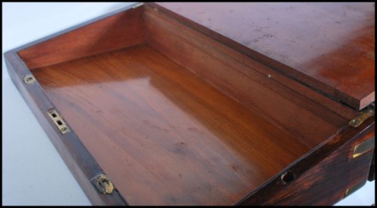 A 19th Century Victorian brass bound writing slope box. The box with secret drawer having a rosewood body with central escutcheon and fully appointed interior with tooled skiver, ink bottles, sunken brass handles to the side. Measures 50cm wide x 18cm high x 25cm deep