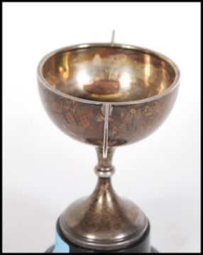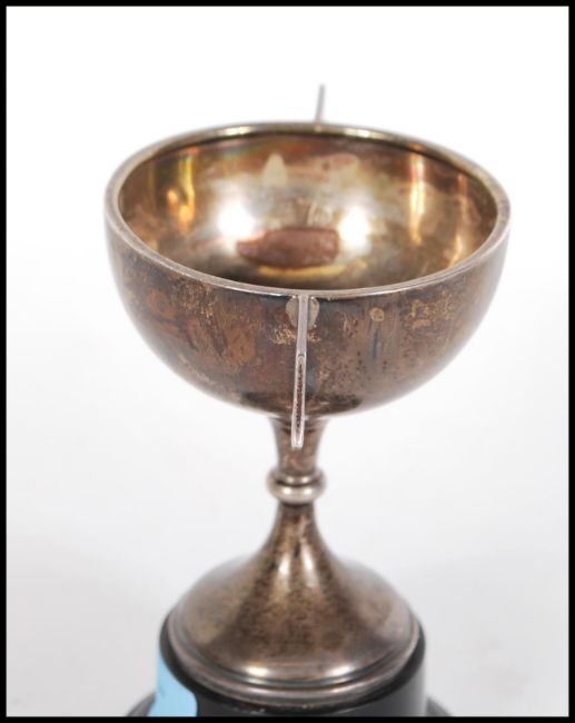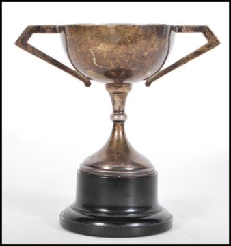 An early 20th Century silver hallmarked Art Deco trophy having triangular geometric handles. Unengraved. Hallmarked Birmingham 1936. Weight 68.4g.