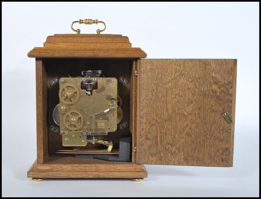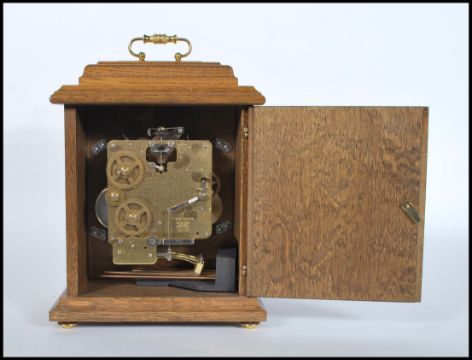 A 20th Century oak cased bracket clock, gilt engraved dial with silver chapter ring, Roman numerals, triple train driven movement chiming on rods, movement stamped for 'Franz Hermle'. Measures: 25cm high x 19cm wide x 13 cm deep.