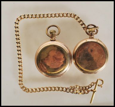 Two gold plated pocket watches, both having white enamel face with Roman numeral chapter ring, faceted hands and subsidiary seconds dial to six. One being made by Elgin Natl Watch Co 14ct gold plated, signed movement no 4260986. The other having a yellow metal watch chain with T bar. Biggest face measures 42mm.