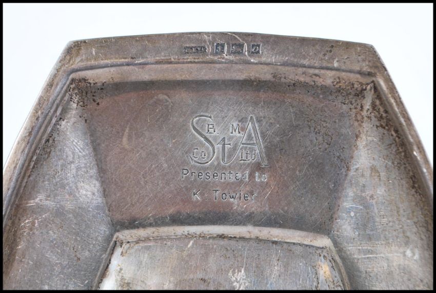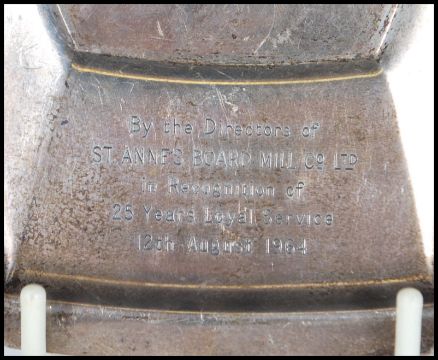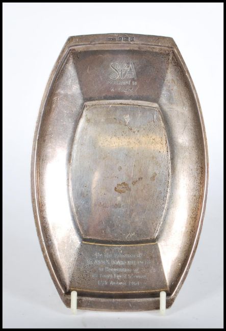 A mid 20th Century silver presentation dish from the directors of St Anne's Board Mill Co Ltd for 25 years service, dated 12th August 1964. Hallmarks for Birmingham date letter O 1963. Makers mark for Colbourne Ltd. Weighs 115.71g.