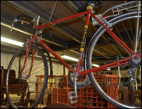 A vintage 20th Century gents ten speed Raleigh Europa touring bicycle / bike, steel frame with caliper brakes.