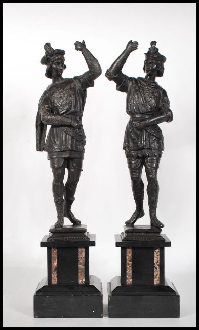 A matching pair late 19th / early 20th Century Spanish spelter figures in the form of two bannermen, having crest to chests raised slate bases with marble inlay. Measures 45cm tall.