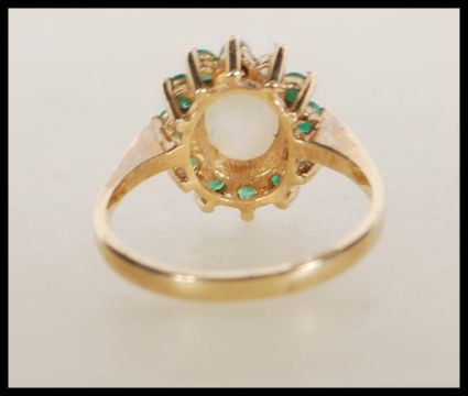 A hallmarked 9ct gold ring set with a central opal cabochon with a halo of green stones. Hallmarked Birmingham 1979. Weight 2.7g. Size L.5.