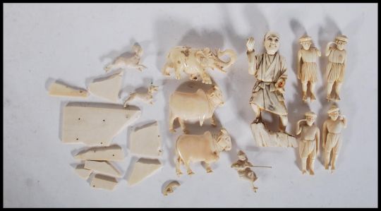 A group of late 19th Century carved ivory figurines to include Indian figures and animals including elephants and cows along with a Chinese figure of a man wearing traditional robes.