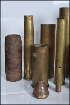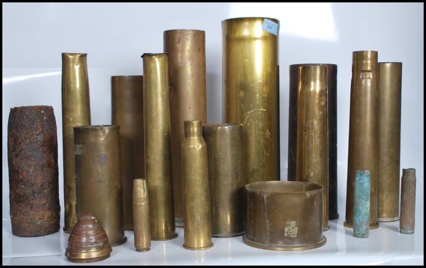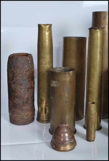 A collection of vintage 20th Century conflicts post second World War trench art modelled from artillery shells, the shells modelled into vases some having fluted tops and most having date and marks to bases. Tallest measures 37cm tall.