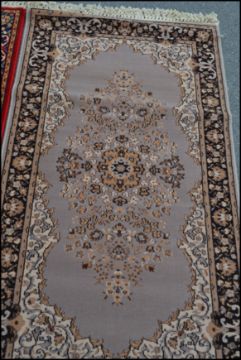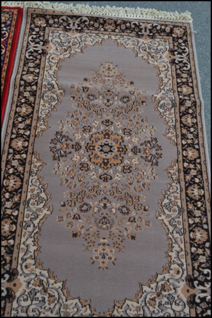 A group of three 20th Century matching floor rug / runners on different coloured grounds, each with a matching central panels set within floral borders, tasselled ends. Measures 42cms H x 106cms W x 44cms D.