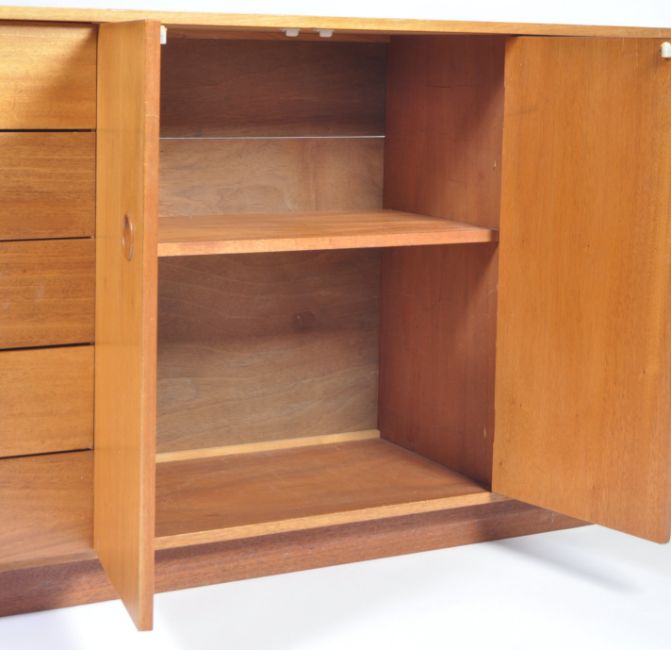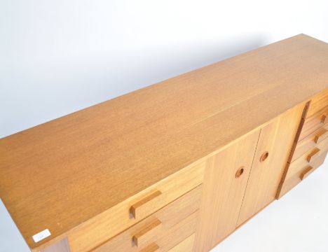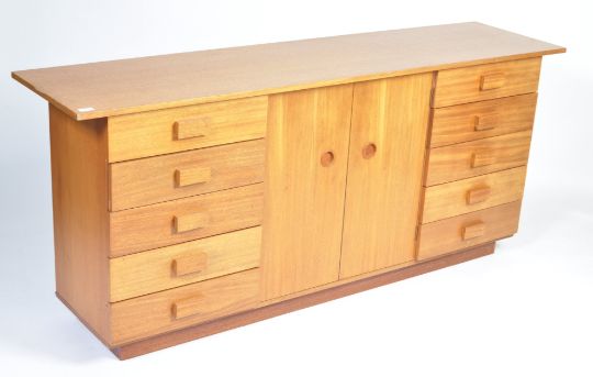 A stunning bespoke 1970's retro vintage teak wood sideboard credenza having a central double door revealing a shelved interior flanked by banks of five drawers to either side. The sideboard having a larger top and raisd on a plinth base. Measures; 79cm x 184cm x 46cm.