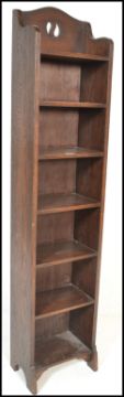 A tall early 20th century, circa 1920's Arts & Crafts oak library bookcase cabinet raised on bracket feet with fixed shelves centre having a carved and pierced gallery atop. Dimensions are 182cms x 98cms x 65cms.