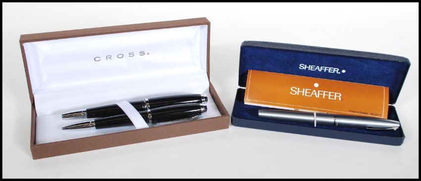 A boxed pen set by Cross consisting of a ballpoint pen and fountain pen finished in black. Together with a boxed Sheaffer fountain pen.