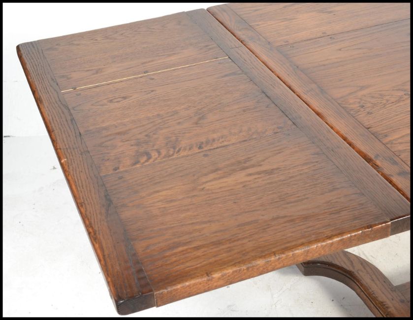 An excellent solid oak monastic refectory dining table in the Jacobean manner of long, large form. Raised on gun barrel turned supports united by lower periphery stretchers. Above, a fitted frieze frame with extending pull out draw leaves to each end.