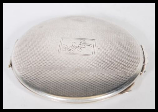 A silver hallmarked roundel shaped ladies powder compact with inset mirror to the lid, powder compartment with door inside. Engine turned with central monogram. Measures 7cms diameter
