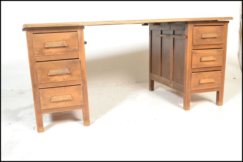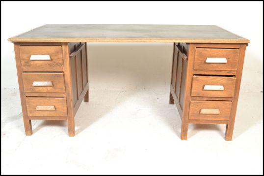 A early 20th Century 1920's Industrial Air Ministry style oak twin pedestal office desk having a bank of three drawers to both sides with rectangular top with dark green/ black leather writing skiver. Measures: 78cm high x 106cm wide x 84cm depth.