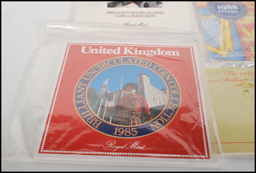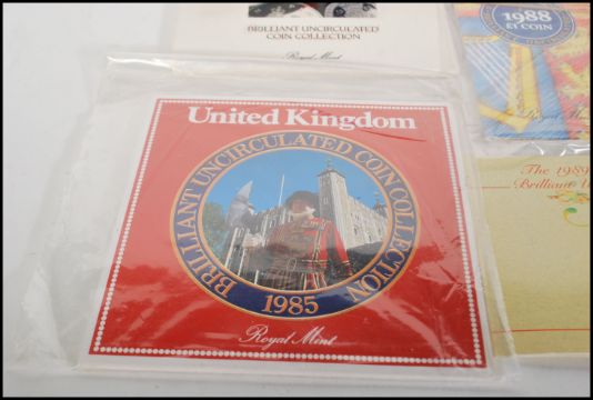 A collection of Royal Mint Brilliant Uncirculated Coins from the united kingdom to include 1985 coin set x 2, 1989 £2 Bill of Rights coin, 1987 coin set x 2, 1987 £1 Oak coin x 2, 1988 £1 coin x 2, 1989 coin set x 2 amd 1987 coin set.