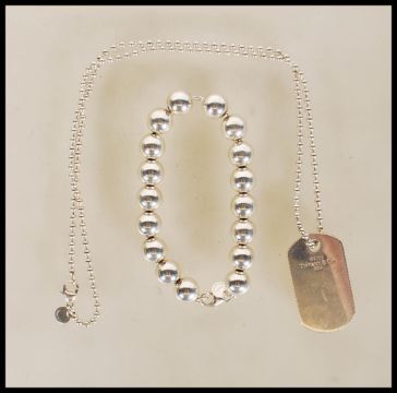 A Tiffany & Co silver pendant having texted edging stamped to back 925 on a ball chain necklace having lobster clasp. Together with a Tiffany and Co silver ball bracelet, hallmarks rubbed. Together weigh 44g. Chain measures 19 inches long.
