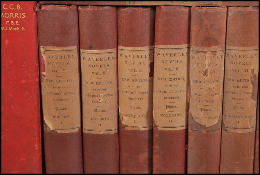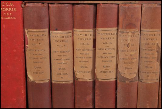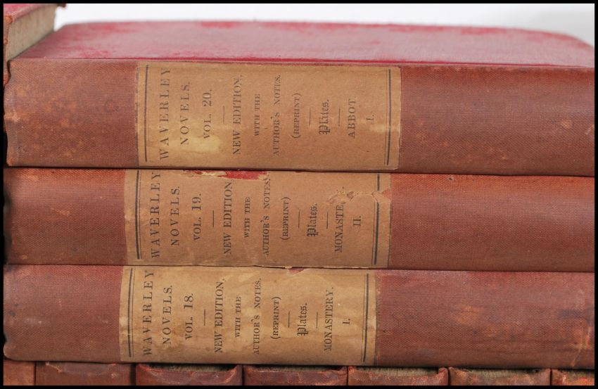 A large collection of 19th Century Victorian Waverley Novels books, over forty volumes, each a new edition with noted from the author, printed by Archibald Constable 14 Parliament St, Westminster 1896,together with other similar aged books.