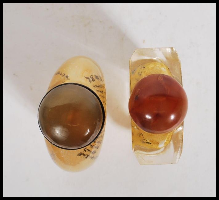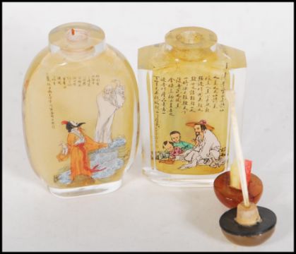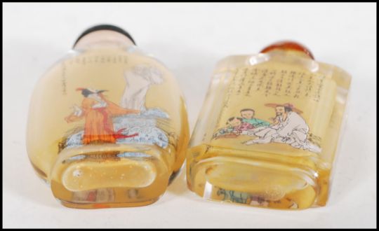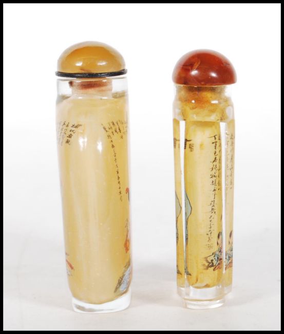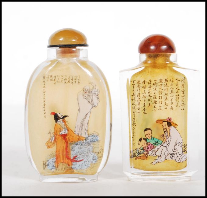 A pair of 20th Century Chinese glass perfume scent bottle, interior painted with elders, figures and character mark decoration with stoppers atop. Tallest measures 9cm tall.